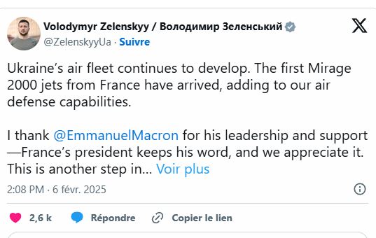 « La flotte aérienne de l’Ukraine continue de se développer. Les premiers Mirage 2000 français sont arrivés, renforçant nos capacités de défense aérienne », s’est-il félicité sur X.